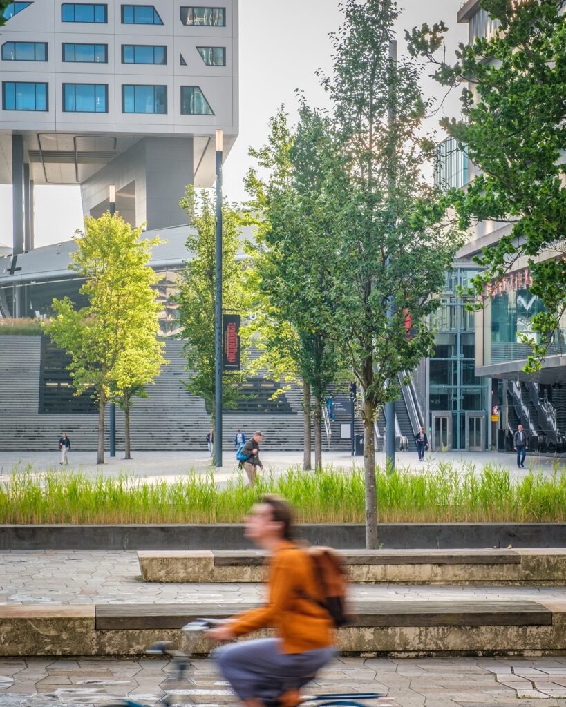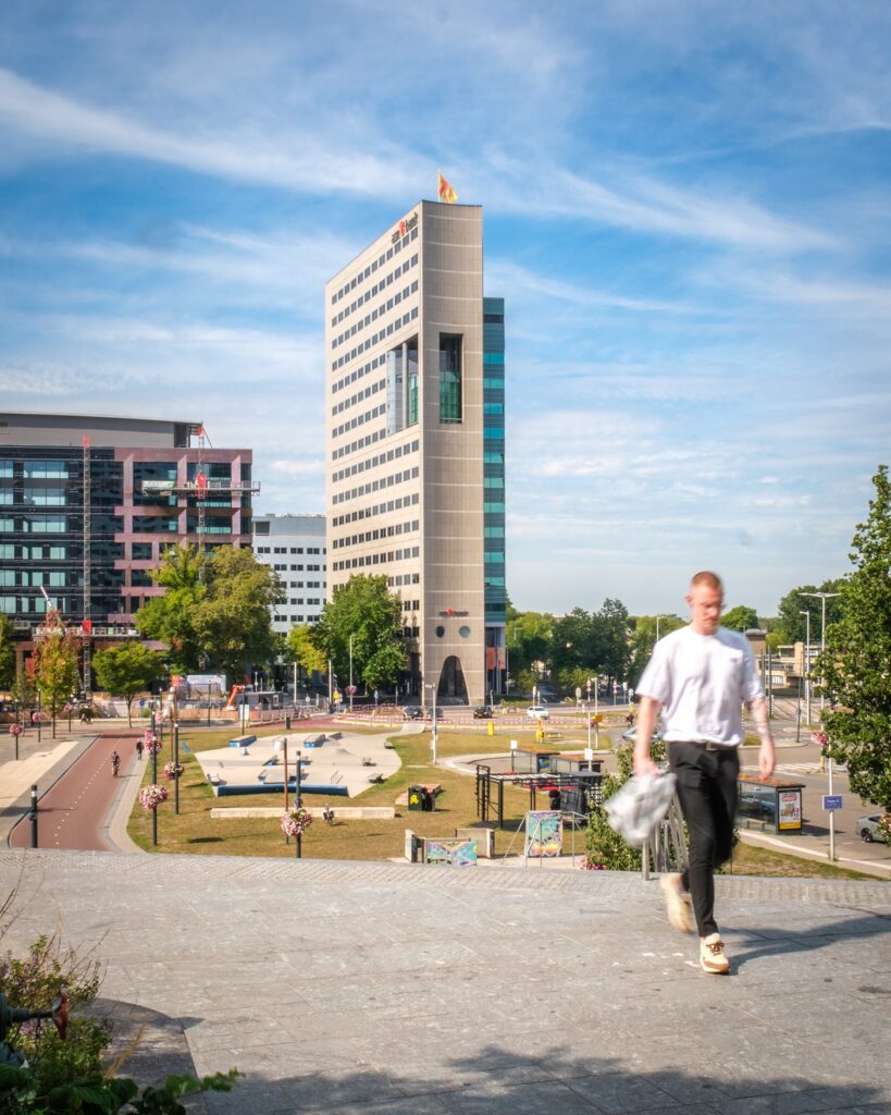 Wanneer je aan de Jaarbeurszijde het station uitloopt, kijk je uit over het Beursplein. Dit centrale plein is het hart van een gebied vol ondernemerschap en beleving. Je vindt hier hotels, bedrijven en start-ups – en genoeg plekken om af te spreken, te lunchen of ideeën uit te wisselen.